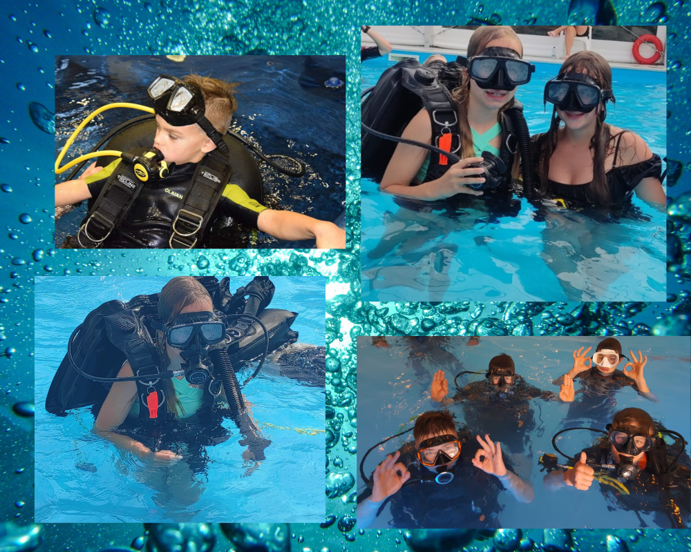 Zajęcia z nurkowania, czyli pierwszy oddech pod wodą. Pod okiem instruktorów uczestnicy zapoznają się z działaniem sprzętu nurkowego (automat, jacket, butla) i rozpoczynają przygodę z nurkowaniem w pełnym ekwipunku. Zajęcia odbywają się na basenie. Świetna atrakcja dla dużych i małych.